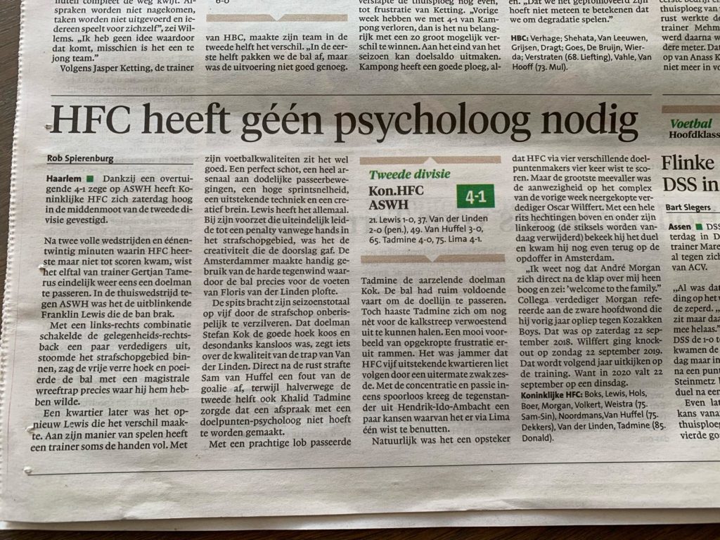 Nadat Franklin Lewis een goede eerste seizoen als senior heeft gedraaid bij zijn jeugdclub Koninklijke HFC, gaat hij vrolijk verder waar hij gebleven is. De zeer snelle en technisch begaafde voetballer scoorde afgelopen zaterdag de openingsgoal tegen ASWH en hielp zijn ploeg daarmee naar de overwinning 4-1.